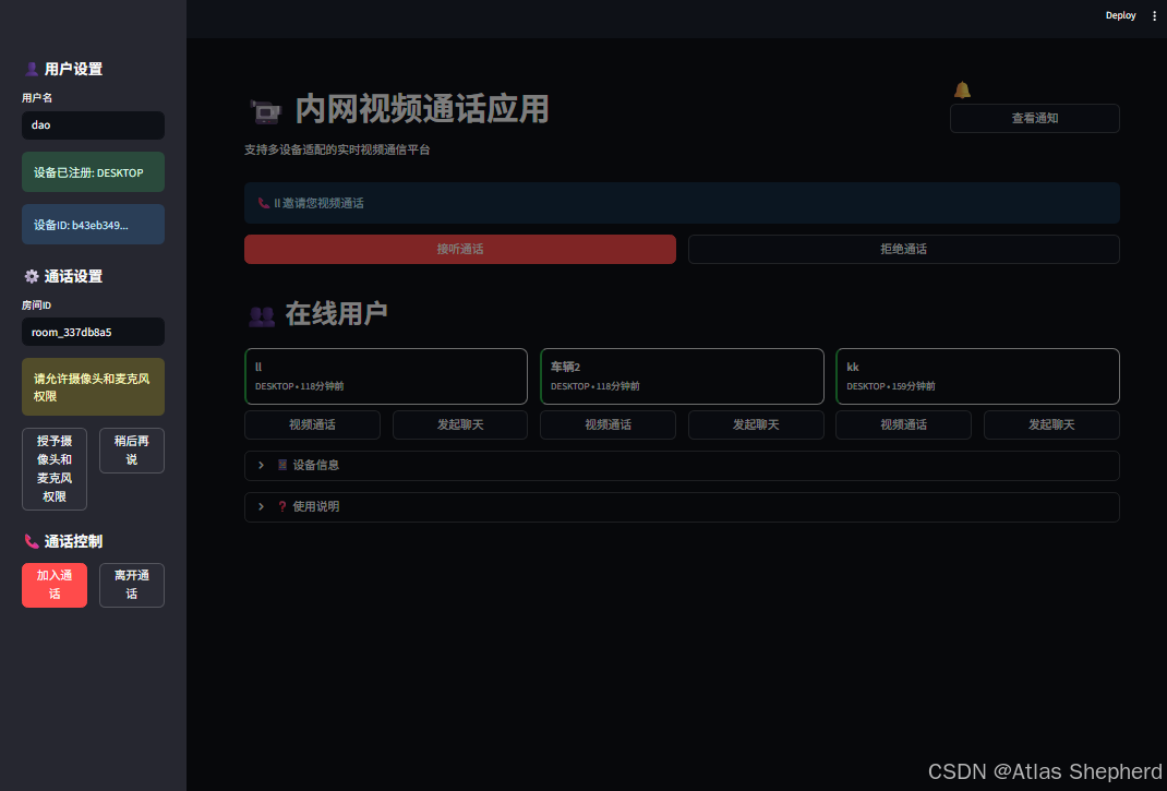 st.header("👤 用户设置")# 用户名输入 username = st.text_input("用户名", placeholder="请输入您的用户名", key="username_input") if username and username.strip(): st.session_state.username = username.strip() # 注册设备 device_id, user_id = register_device(conn, st.session_state.username) device_type = detect_device_type() st.success(f"设备已注册: {device_type.upper()}") st.info(f"设备ID: {device_id[:8]}...") # 通话设置 st.header("⚙️ 通话设置") call_id = st.text_input("房间ID", value=f"room_{uuid.uuid4().hex[:8]}", key="room_input") # 媒体权限检查 video_permission, audio_permission = check_media_permissions() if not video_permission or not audio_permission: request_media_permissions() else: video_enabled = st.checkbox("启用视频", value=video_permission, key="video_check") audio_enabled = st.checkbox("启用音频", value=audio_permission, key="audio_check") # 通话控制 st.header("📞 通话控制") col1, col2 = st.columns(2) with col1: start_call = st.button("加入通话", type="primary", use_container_width=True, key="join_call") with col2: end_call = st.button("离开通话", type="secondary", use_container_width=True, key="leave_call")主内容区域