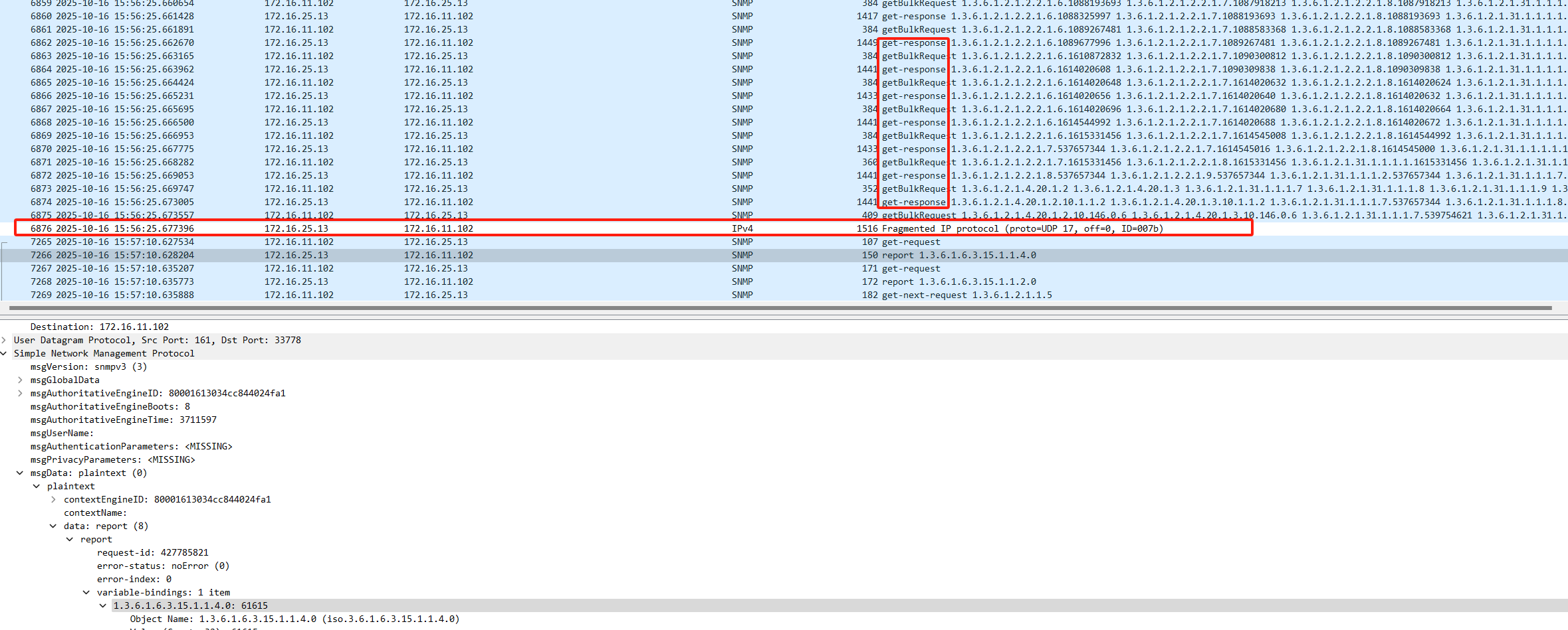 "6876","2025-10-16 15:56:25.677396","172.16.25.13","172.16.11.102","IPv4","1516","Fragmented IP protocol (proto=UDP 17, off=0, ID=007b)"