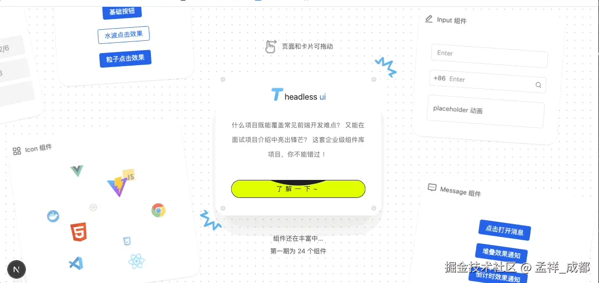 css和tailwindcss在headless也就是无样式组件的基础上,再次封装一个有样式,也就是组件库内容既有headless也有如何将headless组件包装为传统组件库的教程。 - 完整案例,然后会有组件使用案例,其中比较好玩的是创意案例,在