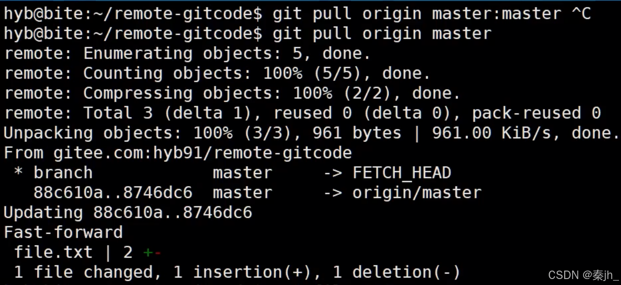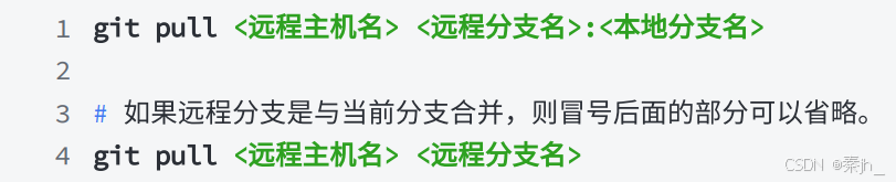 如果远程仓库领先于本地仓库⼀个版本,为了使本地仓库保持最新的版本,我们需要拉取下远 端代码,并合并到本地。Git 提供了 git pull 命令,该命令⽤于从远程获取代码并合并本地的版 本。格式如下: