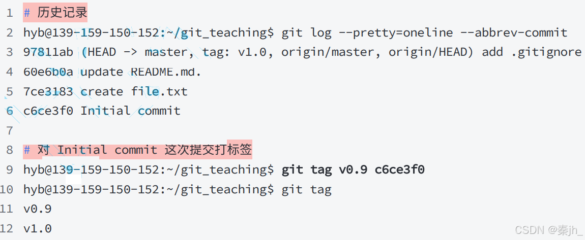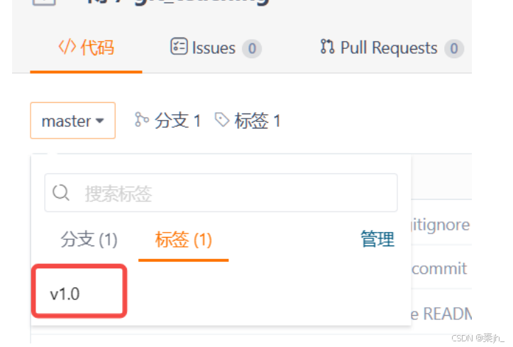 标签 tag ,可以简单的理解为是对某次 commit 的⼀个标识,相当于起了⼀个别名。例如,在项⽬ 发布某个版本的时候,针对最后⼀次 commit 起⼀个 v1.0 这样的标签来标识⾥程碑的意义。