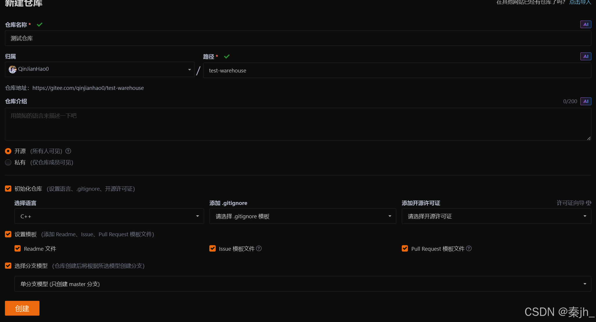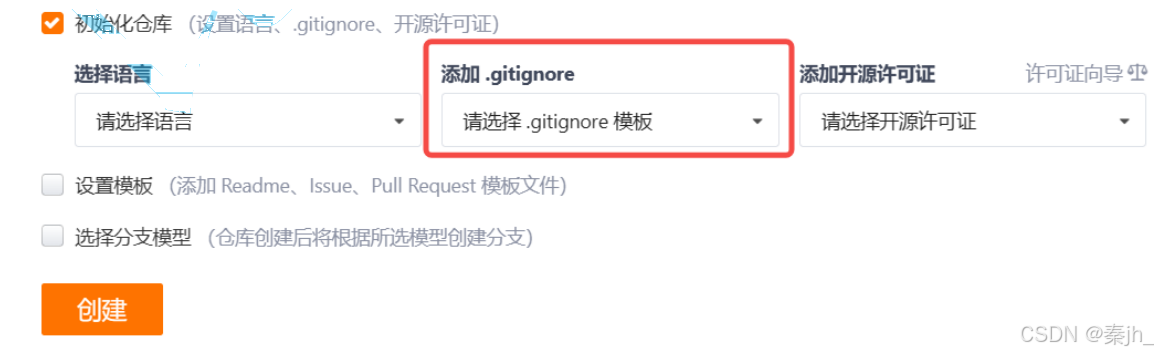 不需要从头写 .gitignore ⽂件,gitee 在创建仓库时就可以为我们⽣成,不过需要我们主动勾选⼀ 下: