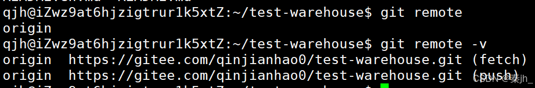 进入到这个仓库里面,通过git remote,可以看到远程仓库的默认名称是origin。加上-v选项后,可以看到我们是有这个仓库的拉取和推送的权限的。