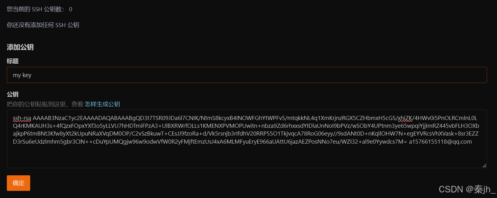 把公钥里的内容全部复制粘贴。标题就是给公钥命名,随意即可。