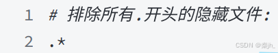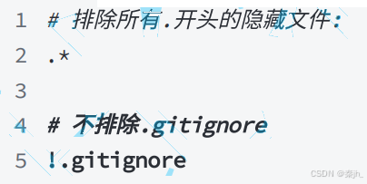 但是我们发现 .* 这个规则把 .gitignore 也排除了。虽然可以⽤ git add -f 强制添加进去, 但还是希望不要破坏 .gitignore 规则,这个时候,可以添加⼀条例外规则: