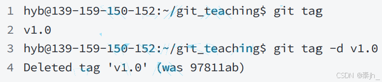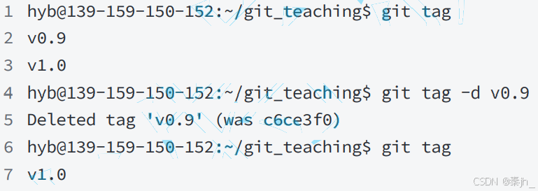 如果标签已经推送到远程,要删除远程标签就⿇烦⼀点,先从本地删除:
