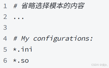 如果当时没有选择这个选择,在⼯作区创建⼀个也是可以的。⽆论哪种⽅式,最终都可以得到⼀个完 整的 .gitignore ⽂件,例如我们想忽略以 .so 和 .ini 结尾所有⽂件, .gitignore 的内容 如下: