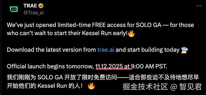 Trae v3.0.0 发布了,令人激动的是,刚刚,Trae 宣布 SOLO 模式正式上线,并且限时全员免费!此前 Solo 模式需要邀请码才能使用。除此之外 SOLO 模式还做了全新升级,SOLO Coder 和 SOLO Builder 都得到了增强。