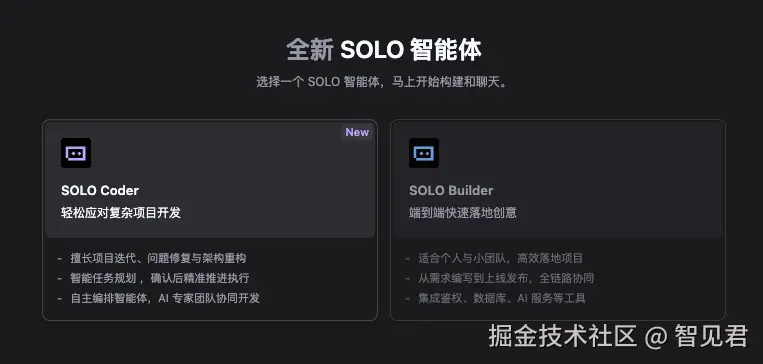 其次是产品定位,SOLO Coder 和 SOLO Builder 的设计,体现了 Trae 对不同开发场景的理解。它不是简单地做一个大而全的工具,而是针对不同需求提供专门的解决方案。
