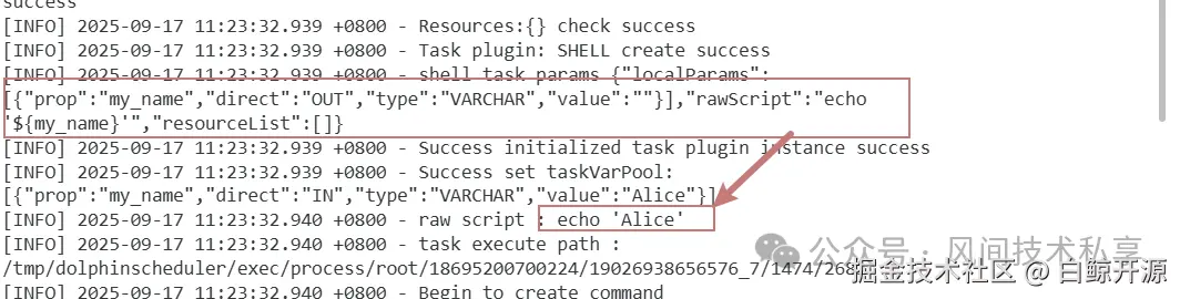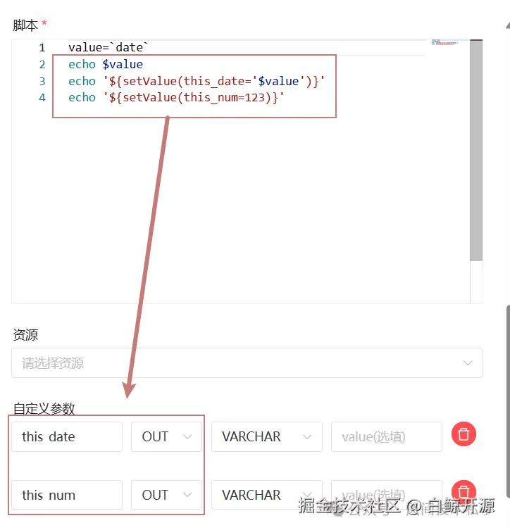 - OUT 表示局部参数可以向下游传递。参数优先级:DolphinScheduler