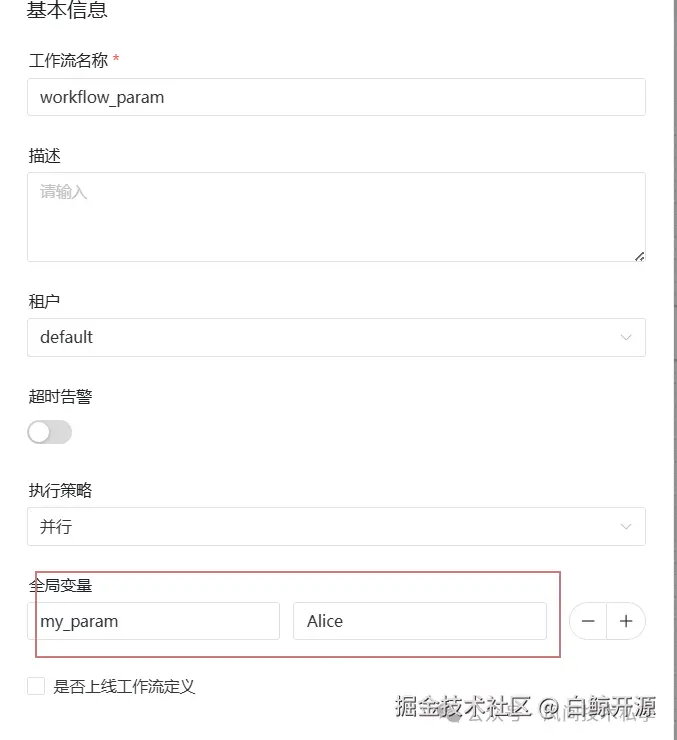 当多个任务需要使用相同的自定义变量(如环境标识、项目编号等),可通过工作流全局参数统一管理。