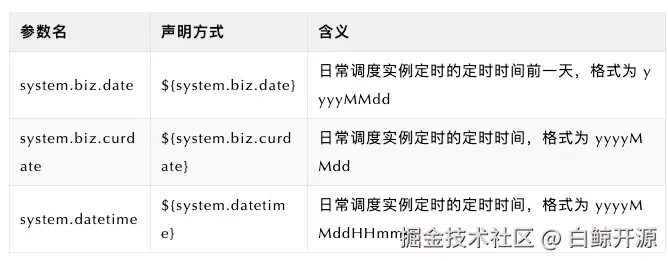 DolphinScheduler 提供了几个常用的系统级内置参数,主要用于获取调度实例的执行时间。这些参数无需定义,直接引用即可。