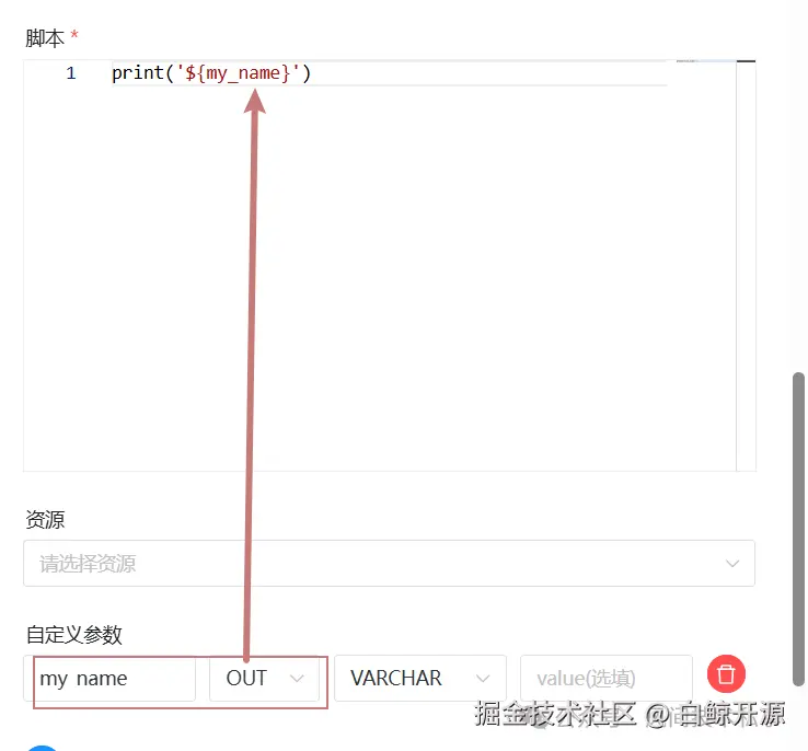 - 自定义参数中也使用my_name作为参数,选择OUT类型,用于往下传递