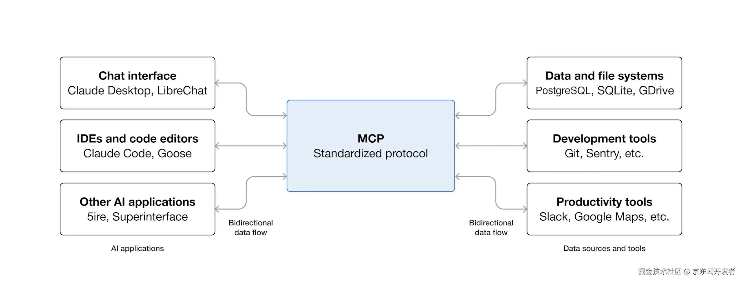 通俗理解: MCP就像是「AI应用的USB接口标准」。就像USB让不同设备都能接入电脑一样,MCP让不同的数据源和工具都能以统一方式接入AI应用。