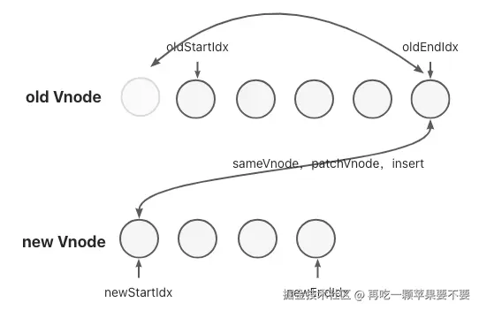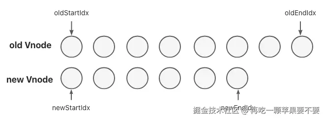 新老两组VNode节点的左右头尾两侧都有一个变量标记,在遍历过程中这几个变量都会向中间靠拢,oldStartIdx > oldEndIdx或newStartIdx > newEndIdx时结束循环