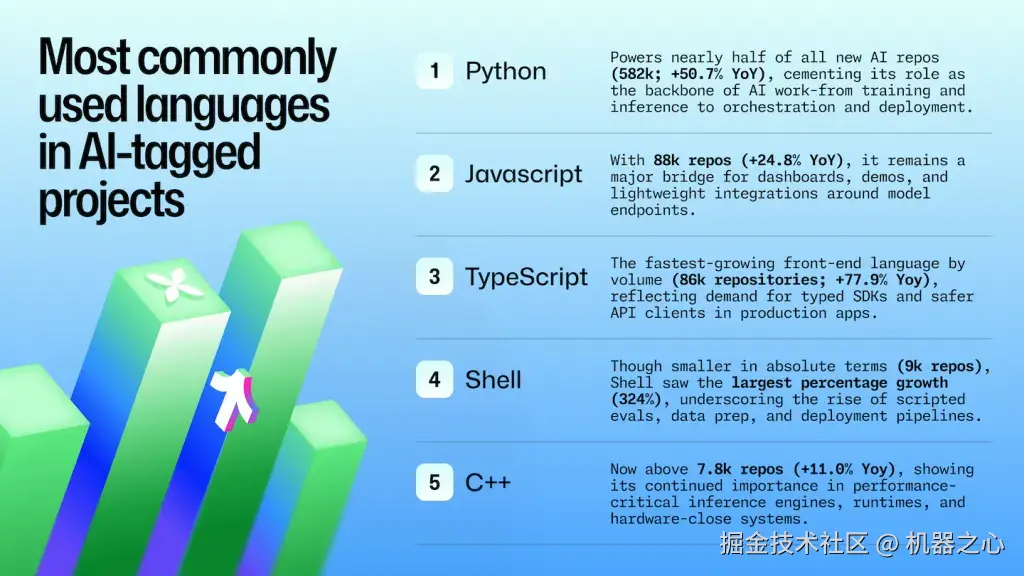 Shell 脚本(+324%)成为增长最快的类别,反映了团队如何将评估工具、数据准备和部署流程代码化。C++ 则跨越了 7,800 个仓库(+11%),稳步提醒着人们它在性能攸关的推理引擎、运行时和近硬件(hardware-close)系统中所扮演的角色。