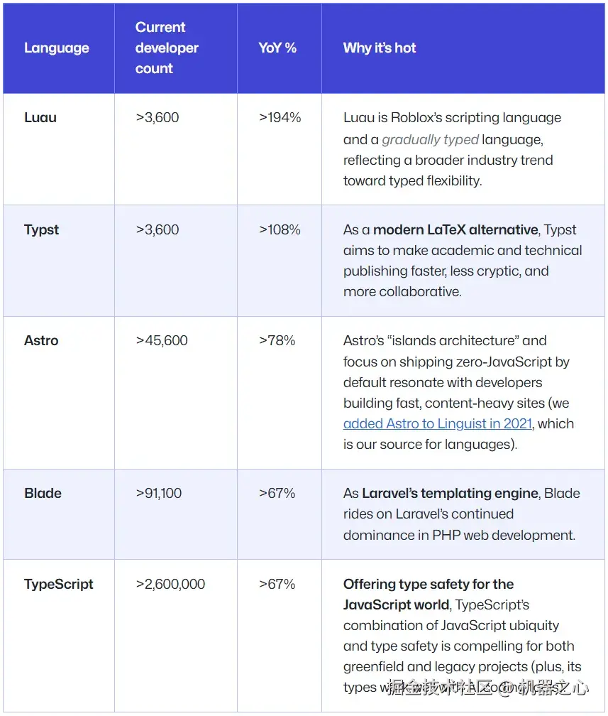 增长最快的语言是 Luau。Luau 是 Roblox 的脚本语言,也是一个逐步类型化的语言,体现了整个行业向「类型灵活性」发展的趋势。