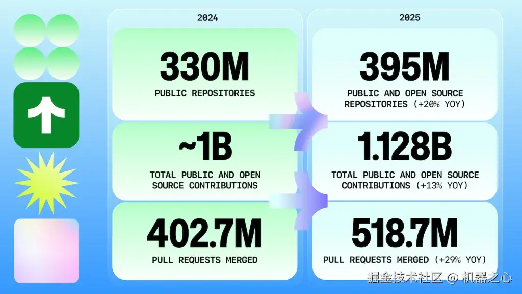 今年,开源开发活动达到了创纪录的水平,公共仓库的贡献总量达到了 11.2 亿次(同比增长 13%)。2025 年 3 月是 GitHub 历史上新增开源贡献者数量最多的一个月。