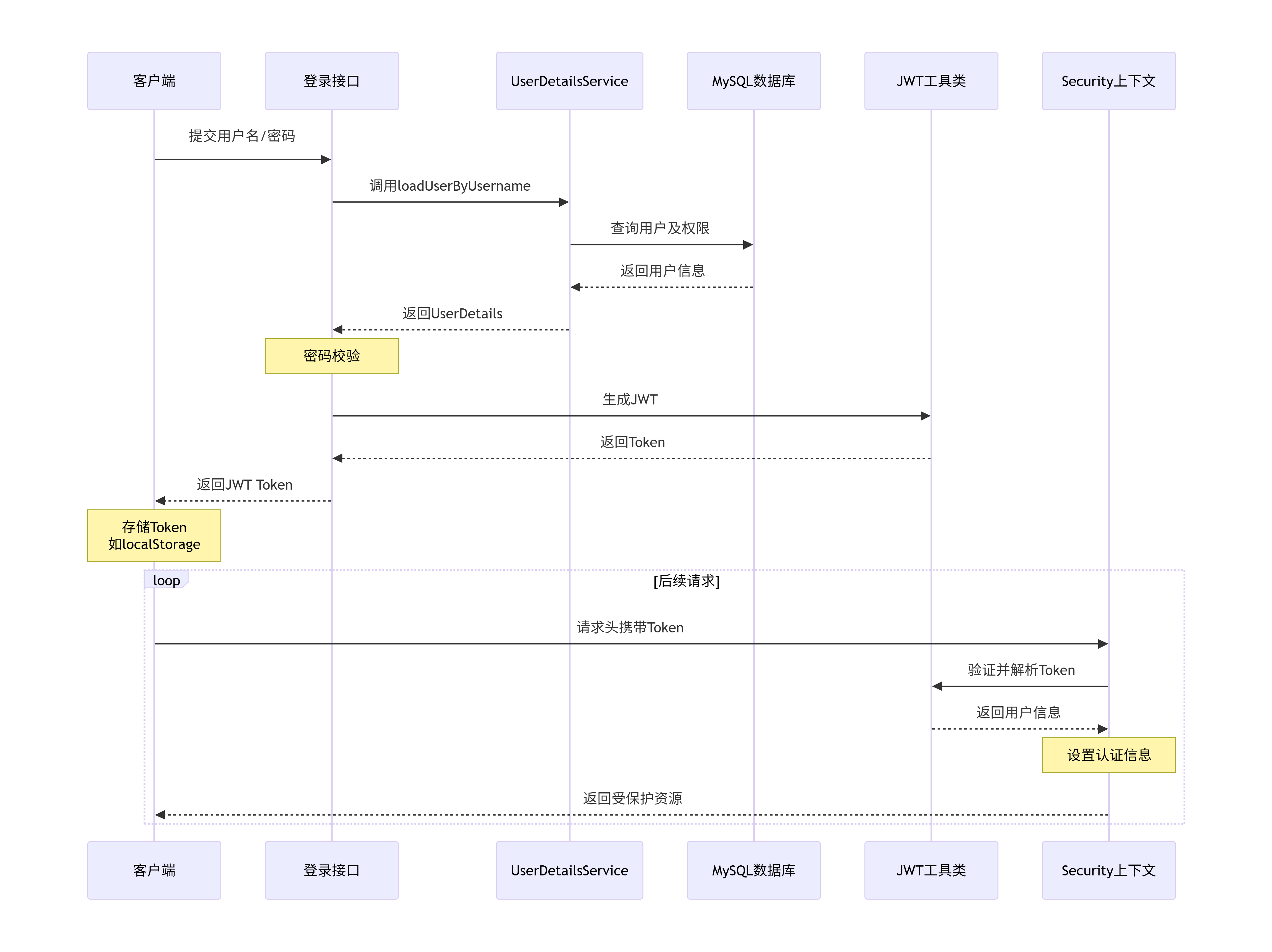 | 4. 权限鉴定 | Spring Security + UserDetailsService | 通过UserDetailsService从MySQL加载用户详情及权限,供Spring Security进行授权决策 |