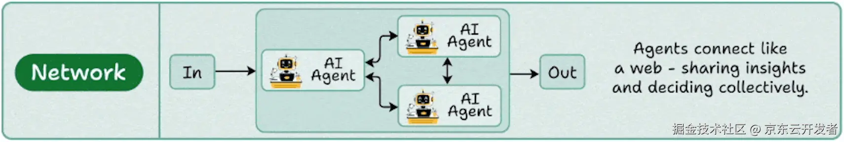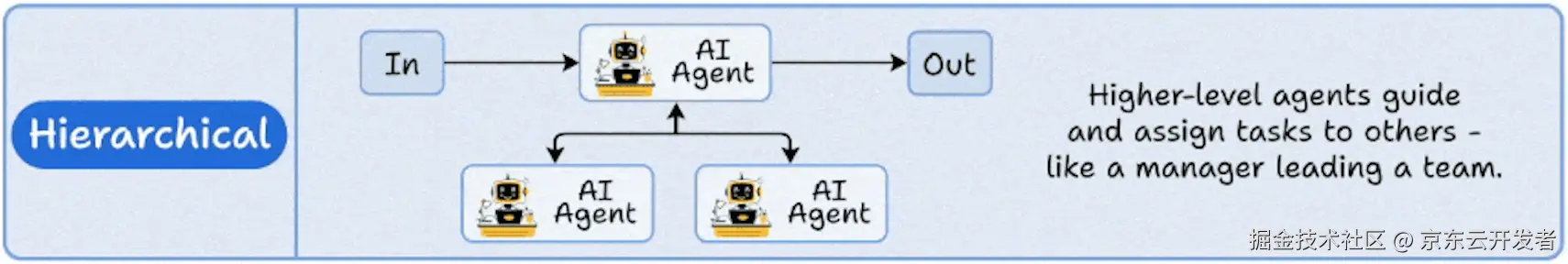 一个顶级规划智能体,将子任务分配给工作智能体,跟踪它们的进度,并做出最终决策。这和经理及其团队的工作方式完全一样(很多中间件的架构也是类似这种模式如Redis、ES、Nocas)。意图识别就是采用此模式。