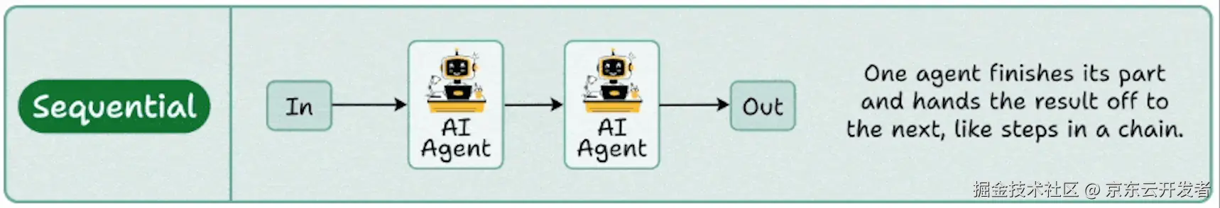 在《Agentic Design Patterns》中叫Prompt Chaining,每个智能体都逐步地完成输出,比如一个生成代码,另一个审核代码,第三个部署代码。每一步的输出作为下一步的输入。这种信息传递建立了依赖链,前序操作的上下文和结果会引导后续处理,使 LLM 能够在前一步基础上不断完善理解,逐步逼近目标解。