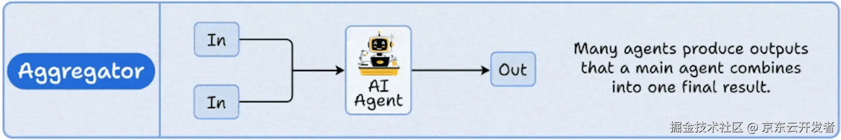 许多智能体生成部分结果,由主智能体将这些结果整合为一个最终输出。因此,每个智能体都形成一个观点,而一个Master智能体将这些观点汇总成共识。在RAG的检索融合、投票系统等场景中很常见。