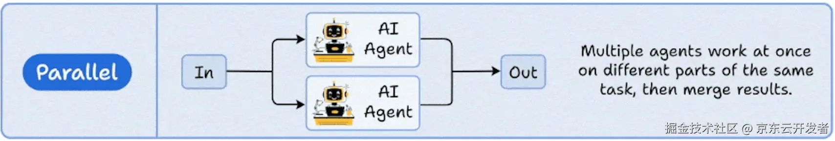 每个智能体负责处理不同的子任务,例如数据爬虫、网络检索和摘要生成,它们的输出会合并为一个单一结果。非常适合减少高吞吐量管道中的延迟。(如文档解析或API编排)
