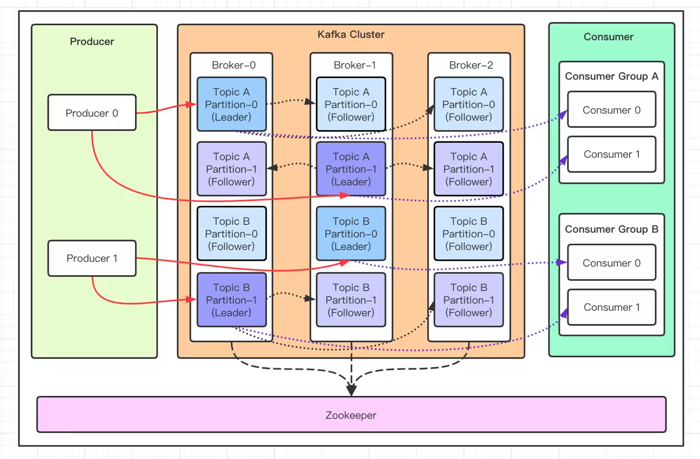 分区(Partition) :分区是 Kafka 并行处理和存储的基本单位。一个主题的多个分区可以分布在不同的 Broker 上,实现负载均衡和水平扩展。消息被顺序写入分区,并以分区为单位进行复制。这个topic的分区有三个,意味着 topic 的消息被 分成了三个独立的、并行的 "数据通道" 来存储和处理。