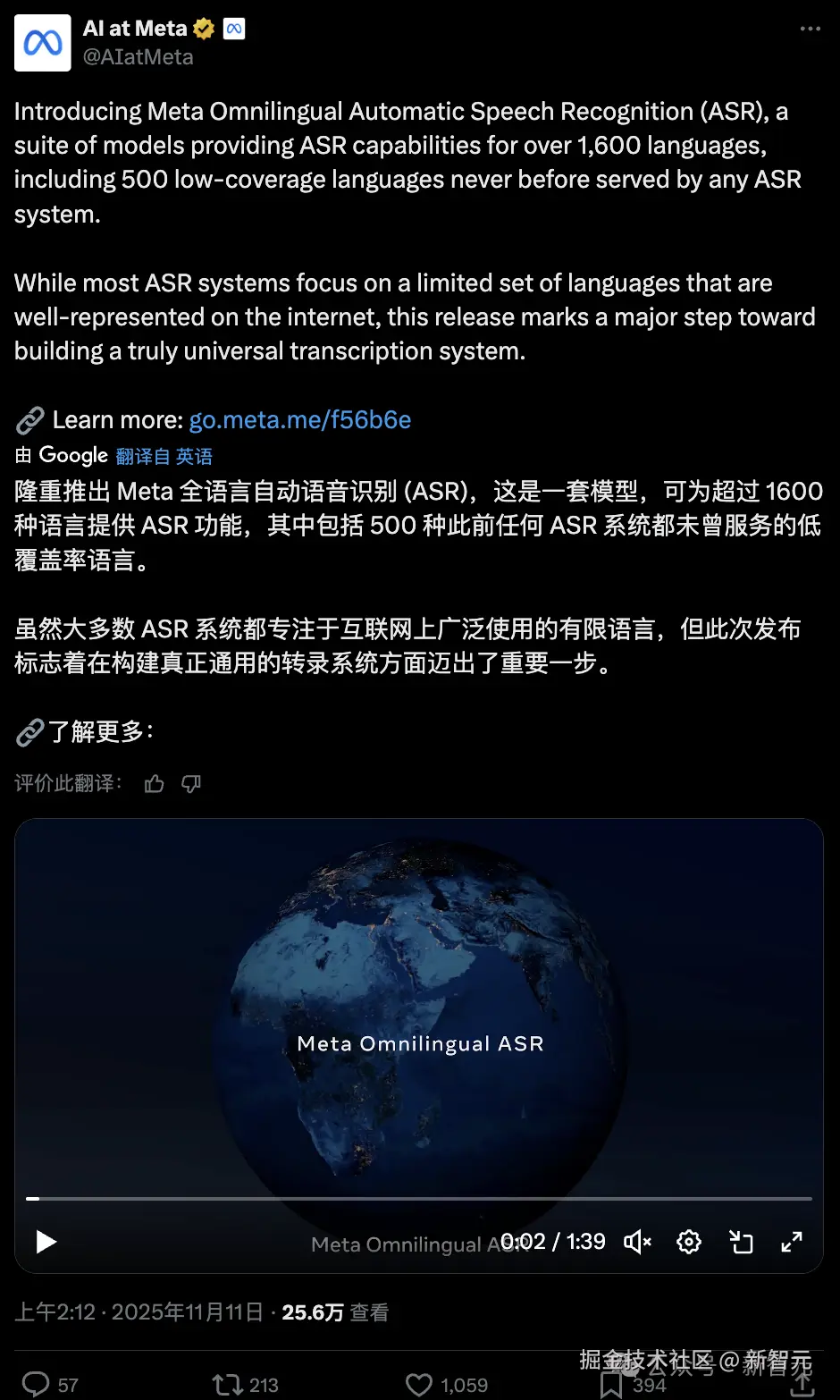 「【新智元导读】在 7000 多种人类语言中,只有少数被现代语音技术听见,如今这种不平等或将被打破。Meta 发布的 Omnilingual ASR 系统能识别 1600 多种语言,并可通过少量示例快速学会新语言。以开源与社区共创为核心,这项技术让每一种声音都有机会登上 AI 的舞台。」