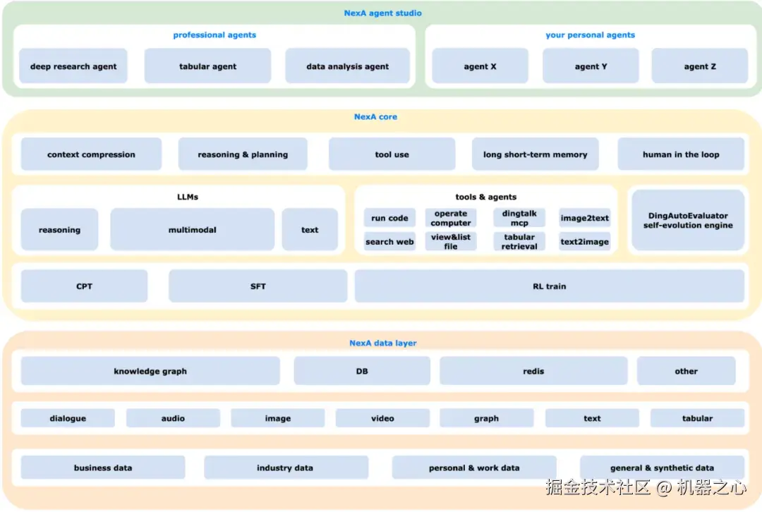 Dingtalk-DeepResearch Agent Studio:这一层提供了专业的智能体,专门用于深度研究、表格数据处理和数据分析。同时,它也支持可定制的个人智能体,以满足不同用户的特定需求。这体现了框架的 flexibility 和个性化能力。
