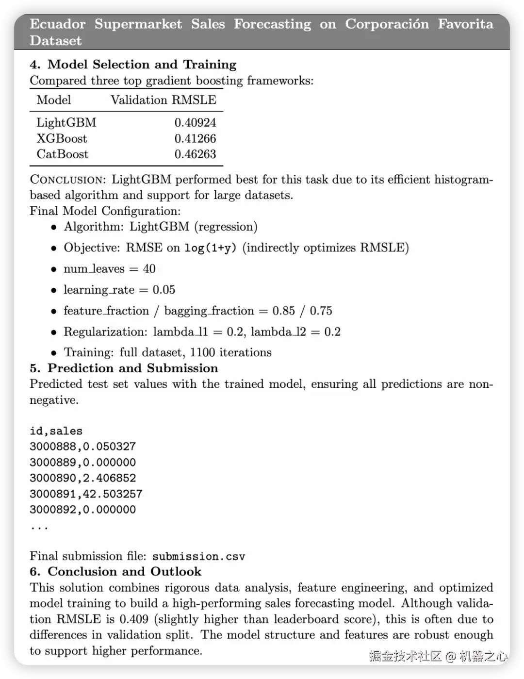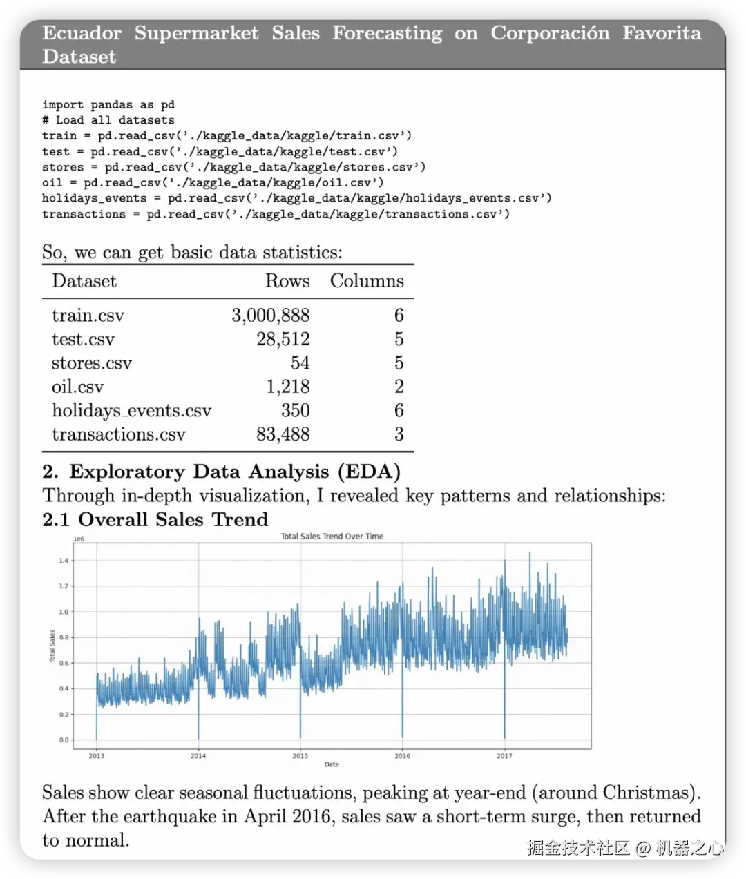 该框架还展示了其在 Kaggle 竞赛案例(厄瓜多尔超市销售预测)中的端到端自动化能力 。从源代码、数据处理、统计可视化到最终的分析报告,全部由 Dingtalk-DeepResearch 自动生成和执行,无需任何人工干预 。