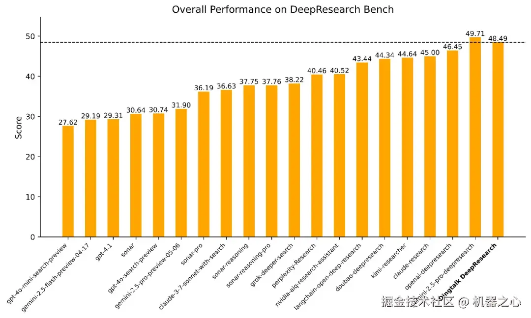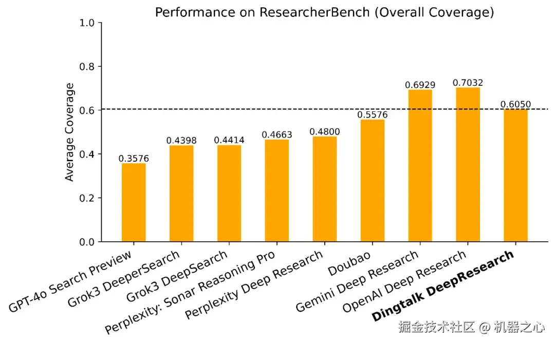 Dingtalk-DeepResearch 在国际权威深度研究评测 DeepResearch Bench 中取得 48.49 高分(全球第二、国内第一),显著超越包括 OpenAI、Claude 在内的主流系统;并在 ResearcherBench 达到 0.6050 平均覆盖率(全球第三、国内第一)。