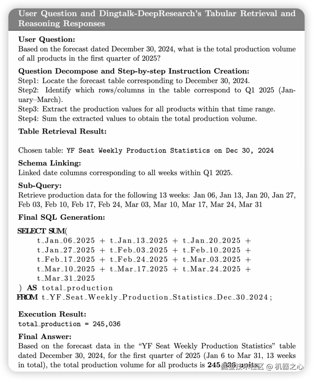在企业环境中,表格数据往往与文本叙述混合,形式多样且结构复杂。Dingtalk-DeepResearch 的表格问答模块通过结合布局感知表格建模和异构检索-执行,实现了精确且可解释的推理。