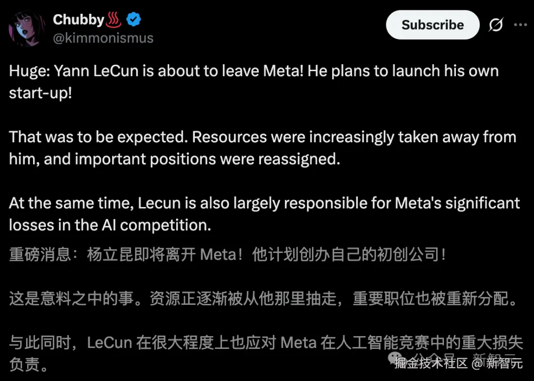 「【新智元导读】AI 圈爆出大瓜!65 岁图灵巨头 LeCun 即将离职 Meta,与小扎正式决裂。接下来,他将投身「世界模型」开启创业下半场。」