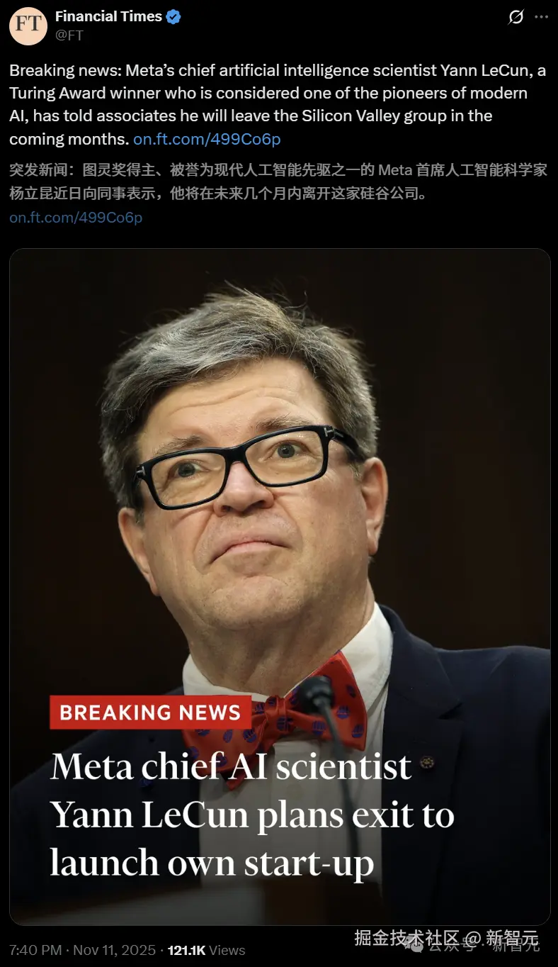 刚刚,FT 独家爆料,现任 Meta 首席 AI 科学家 LeCun,决定将在未来几个月离职。