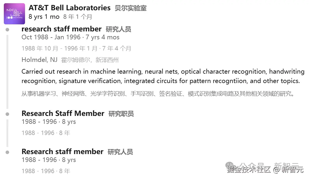 1988 年,博士后研究结束时,LeCun 加入了著名的计算机科学研究中心------贝尔实验室。