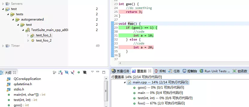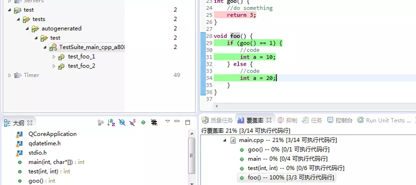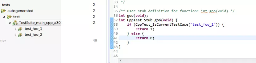 为了达到100%的覆盖率,可以创建两个foo()函数的测试用例,然后创建一个替代goo()函数的桩函数来实现: