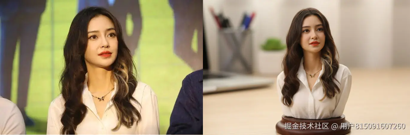 思路:把真人照片转成桌面小摆件(mini figurine)风格,保留面部特征且做出"塑料/陶瓷"质感。