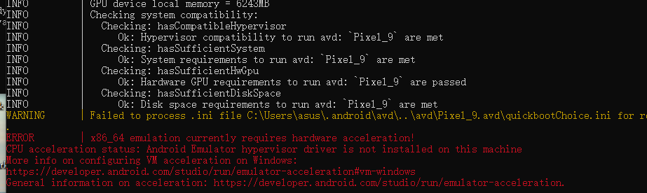 WARNING | Failed to process .ini file C:\Users\asus\.android\avd\..\avd\Pixel_9.avd\quickbootChoice.ini for reading.