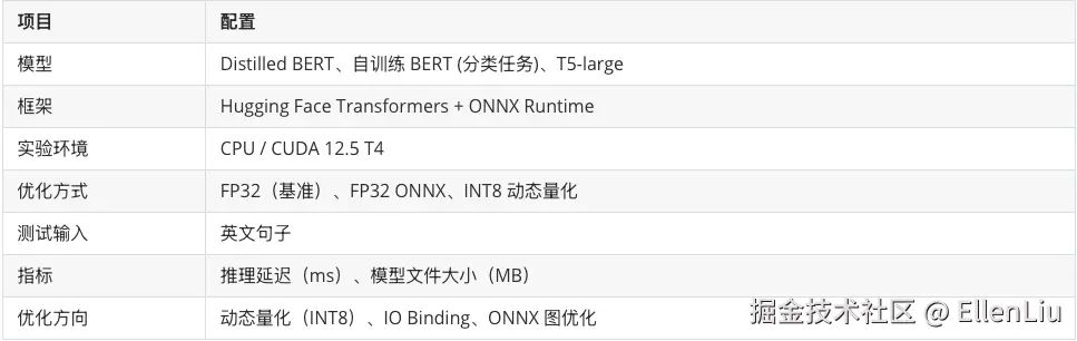 在本实验中,使用 Hugging Face API - optimum.onnxruntime (集成 ONNX Runtime) 将 PyTorch 导出的 ONNX 模型加载后执行推理。