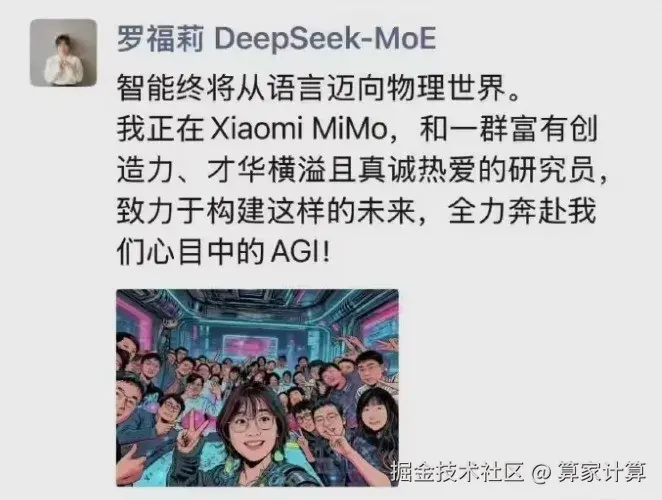今天,前DeepSeek核心研究员罗福莉正式宣布加盟小米,参与其推理大模型Xiaomi MiMo的研发。她在朋友圈写道:"智能终将从语言迈向物理世界。我正在Xiaomi MiMo,和一群富有创造力、才华横溢且真诚热爱的研究员,致力于构建这样的未来。"