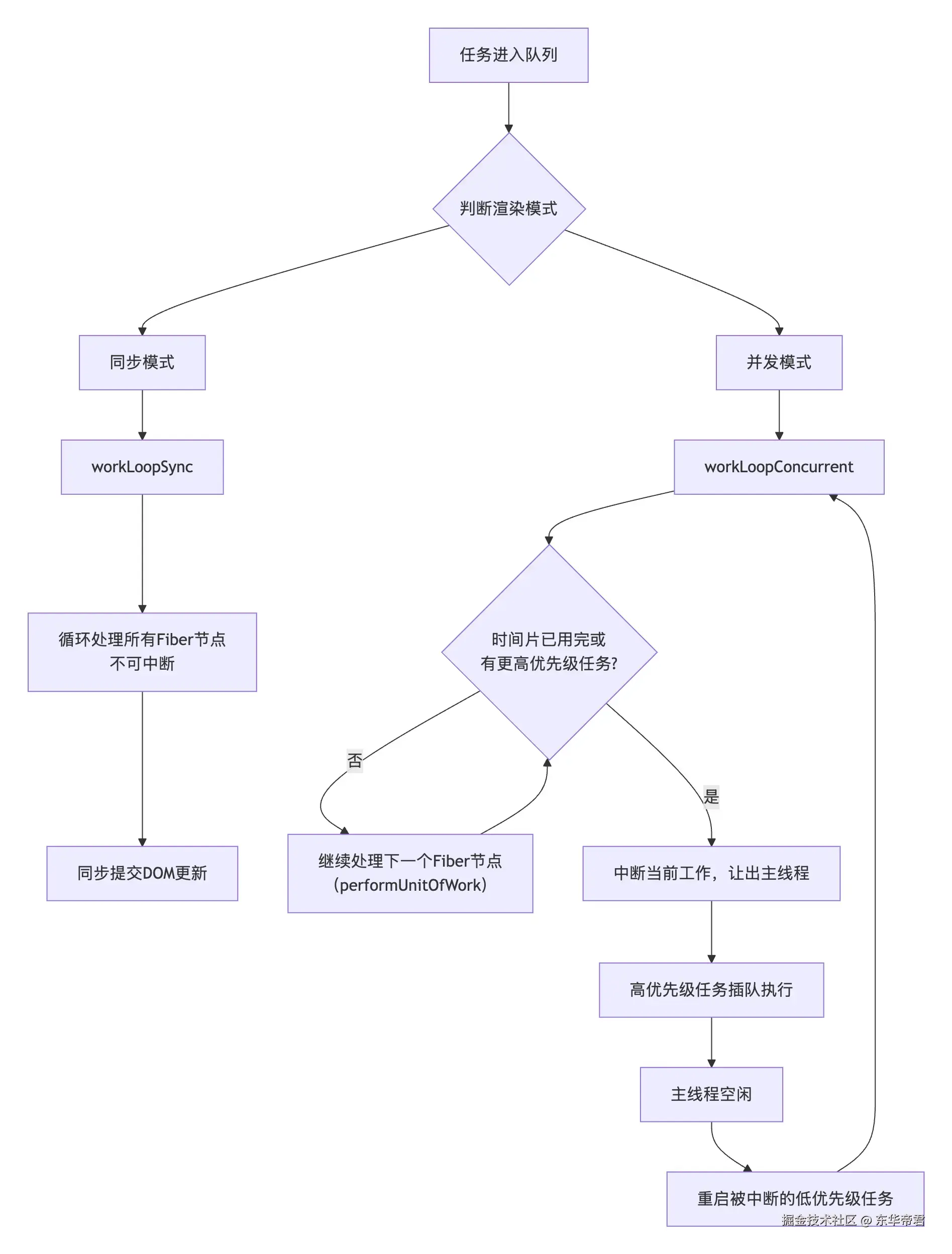 getEventPriority通过switch语句判断事件类型,分配对应优先级。 - 调度渲染:高优先级(离散事件)走同步渲染,低优先级(连续 / 默认事件)走并发渲染。