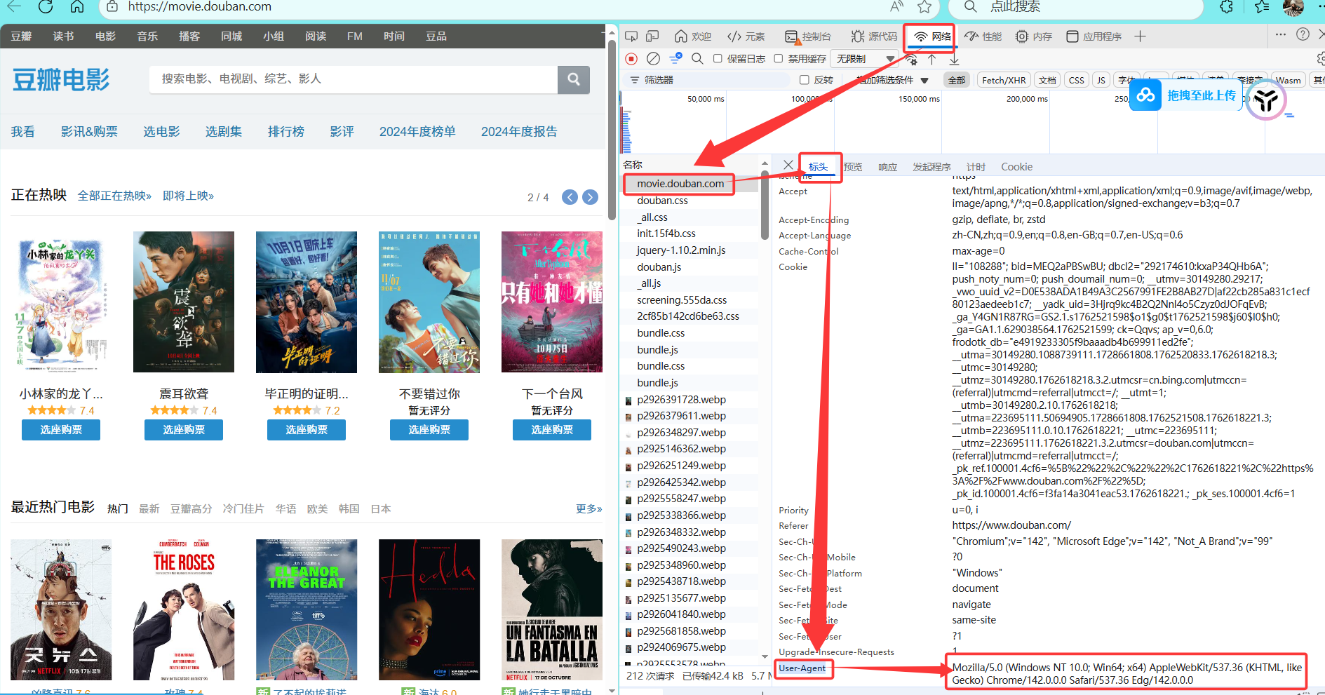 主要是将豆瓣的User-Agent的值,设置到代码的请求头即可。