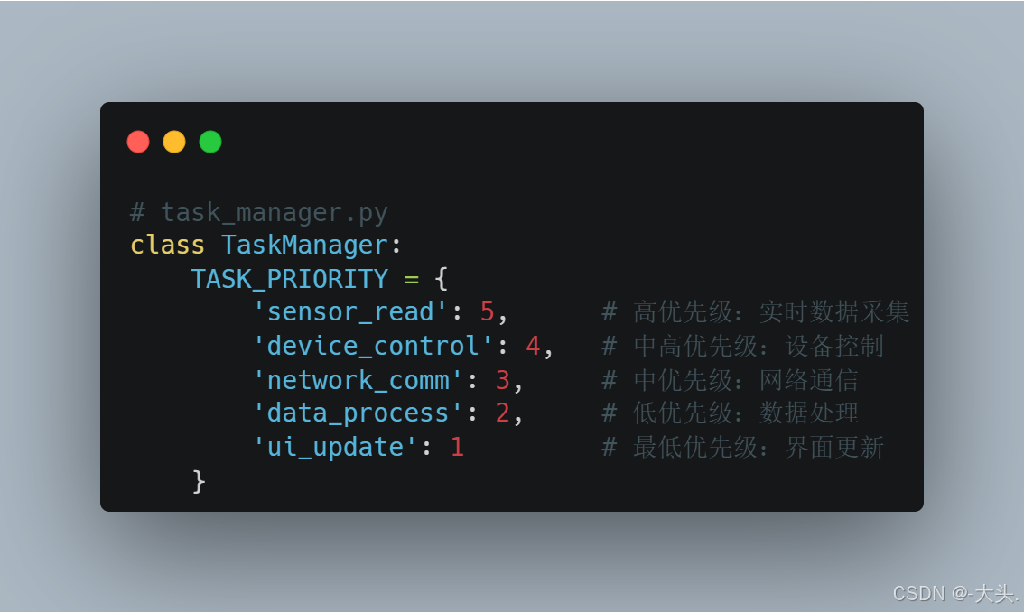 任务优先级: 传感器(5) > 控制(4) > 网络(3) > 处理(2) > UI(1)