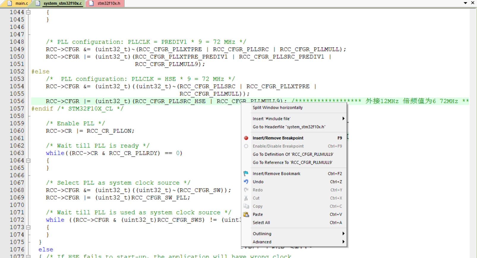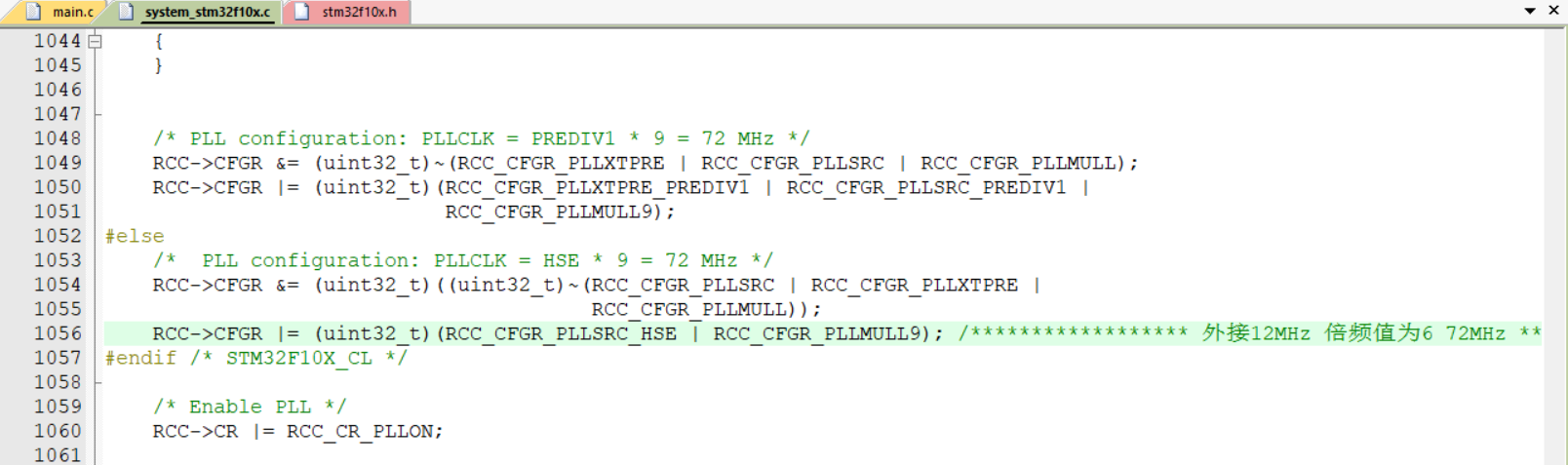 HSE是8MHz,SYSCLK是72MHz,所以要做 PLL 倍频(9倍频)得到 72MHz 系统时钟