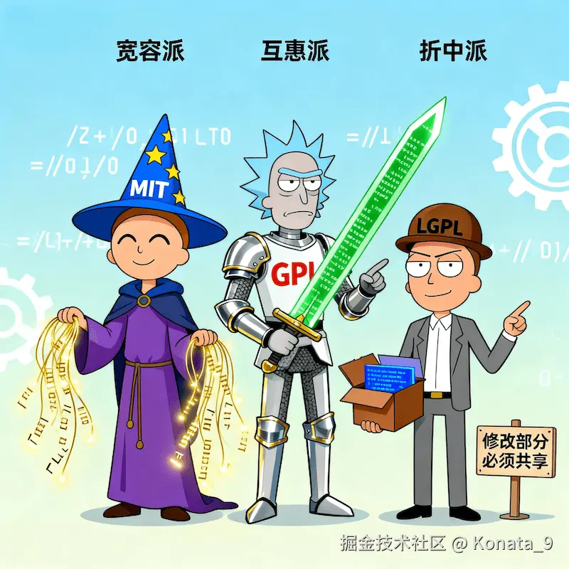许可证的种类繁多,但对于我们日常开发者来说,只需要了解最主流的几种就足够了。为了方便理解,我把它们形象地分成了三个"派别":