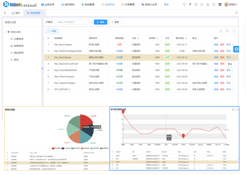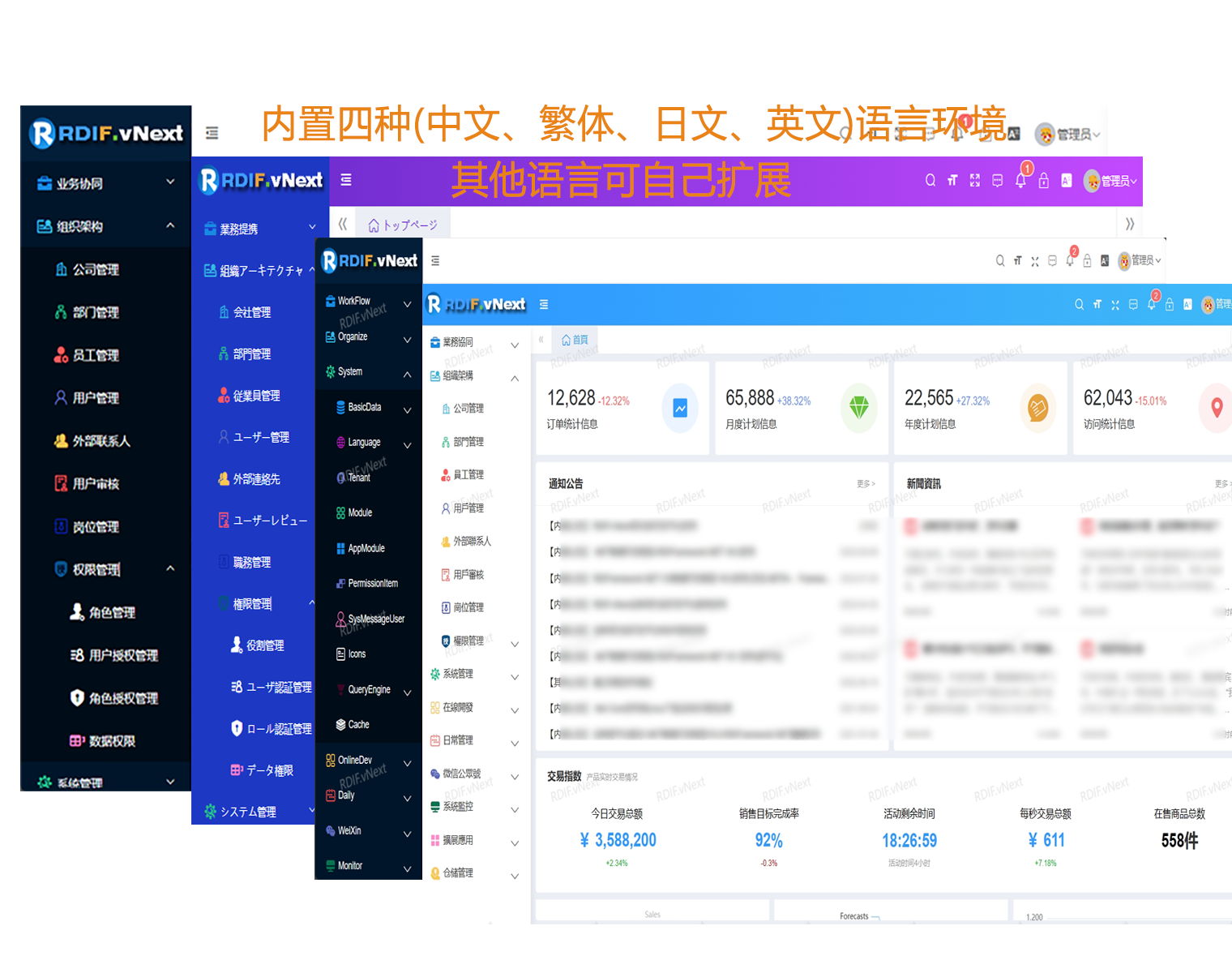 涵盖组织架构、权限、基础数据、模块、消息推送、在线聊天、统计图表、任务调度、日志、缓存、外部整合(如微信等)、大屏、多语言、多租户等海量应用,可无限自由扩展。