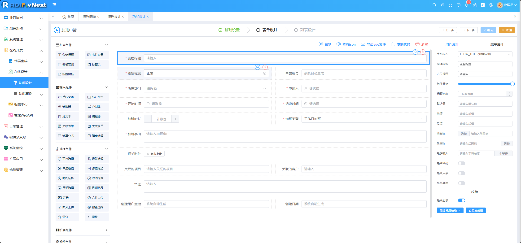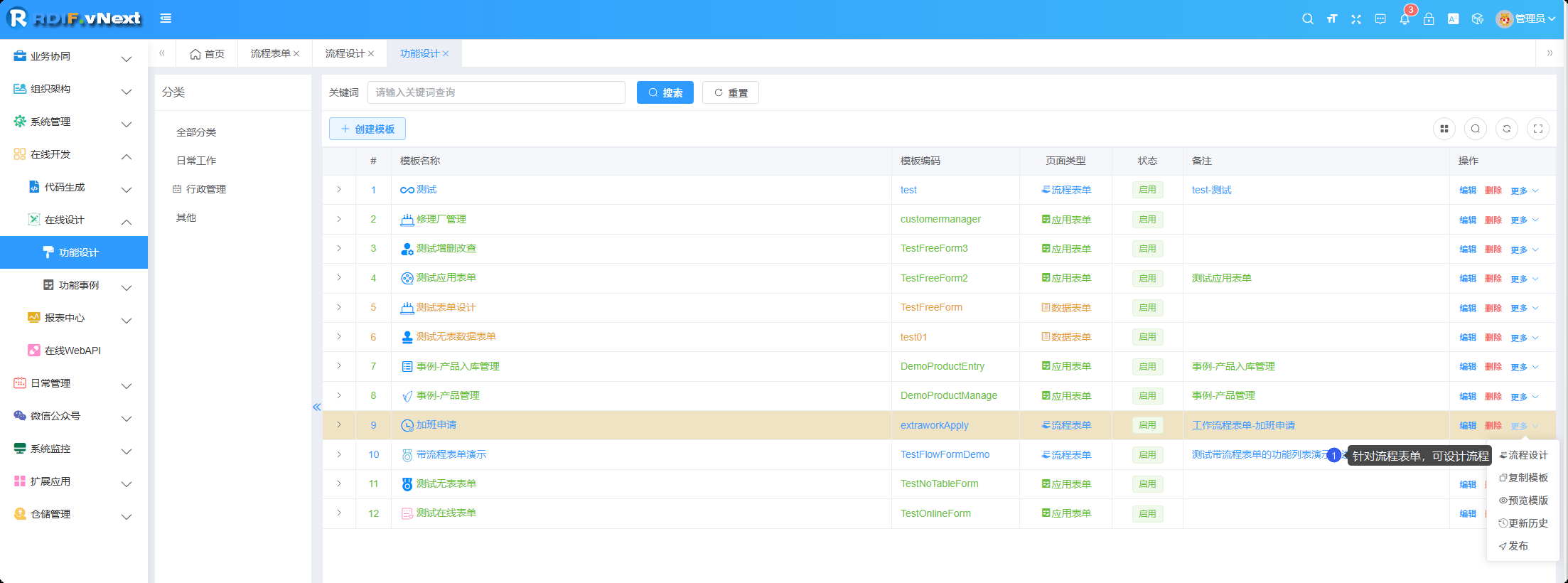 3、功能设计界面针对流程表单的功能设计做了大的调整,在功能设计时先只设计功能界面。设计好后,针对流程表单再单独设计流程。
