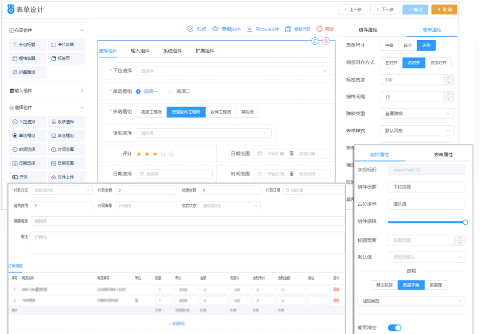 具备拖拽式可视化设计功能,提供多模式(设计生成、极速生成)在线代码生成方式,将复杂业务简单化(低代码),简单业务实现 0 代码,加速业务落地进程。