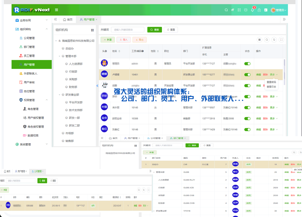 灵活的组织架构设计,实现组织内的角色,流程,数据,消息等互通,支持跨组织业务协同。